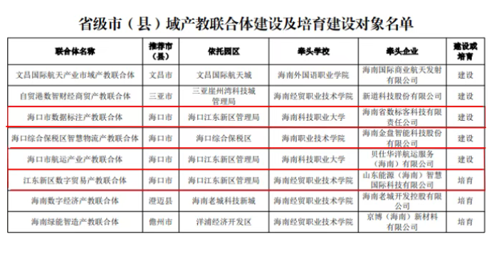 近日,海南省教育厅、海南省发展和改革委员会、海南省人力资源和社会保障厅等三部门联合发文,公布海南省第一批市域产教联合体建设及培育建设对象名单。海口江东新区联合园区内海南科技职业大学、海南经贸职业技术学院等高校,山东能源(海南)智慧国际科技有限公司、海南省数标客科技有限责任公司等企业共同申报的3个项目成功入选。