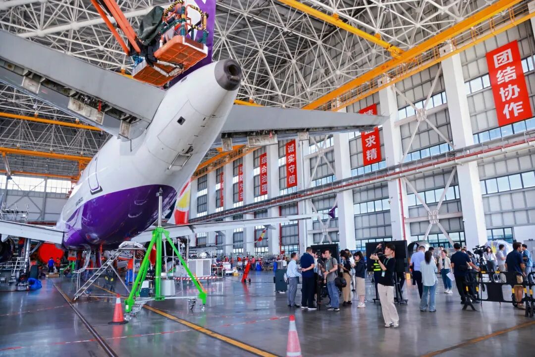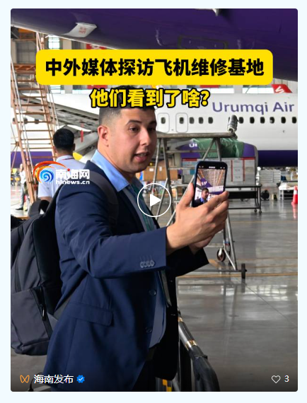20余家中外媒体首站探访海南自贸港一站式飞机维修产业基地。现场多架国际航班在停机坪有序排队等候检修,1号大修定检机库内工人们正在紧张作业,展现出一派繁忙景象。