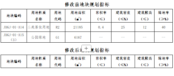 根据项目由市资规局批建且已建范围线,修正JDGJ-01-A14、JDGJ-01-A15(3)地块界线,将JDGJ-01-A15(3)地块部分用地用地性质由公园绿地(G1)修正为二类居住用地(R2)。具体调整内容见下表: