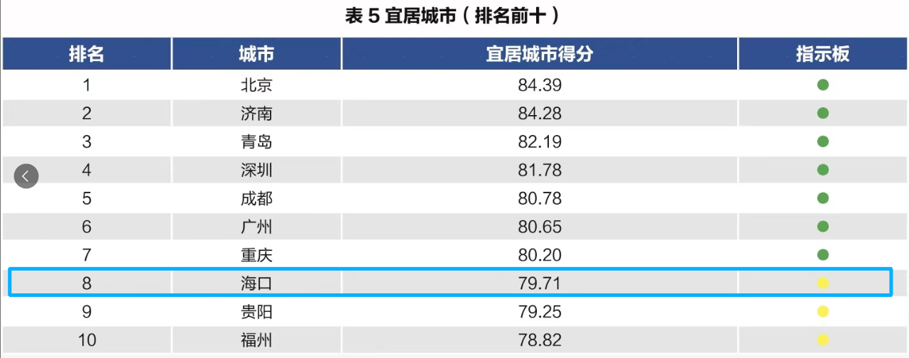 城市综合发展指数测评采用六大维度评价体系,通过90项标准化指标进行评估,采用分类定阈值、数据标准化、等权重赋权、色标指示板四步流程完成测算。其中,宜居城市选取47个宜居城市特征指标,聚焦环境、社会、经济、文化、治理和基础设施等方面开展评估。在这次测评中,北京、济南、青岛、深圳、成都、广州、重庆、海口、贵阳、福州跻身全国宜居城市前十,海口喜获第八名。