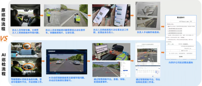 目前,项目已累计实现43平方公里道路及附属设施智能化巡检,比人工巡检效率提升6倍,数据可溯源率100%。智能巡检全程自动化采集分析,现场实况自动统计存储,可溯源便查询,中心平台统一管理巡检车辆、记录与数据,解决了人工巡检时效弱、不安全等痛点。