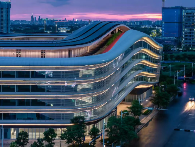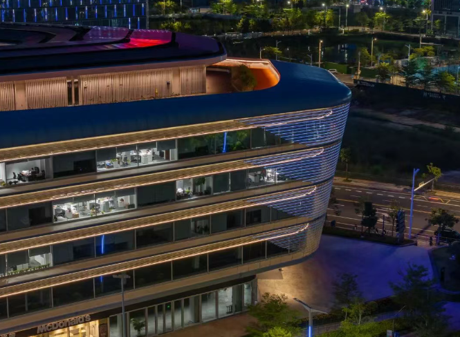 顶部线性光带以流畅的笔触勾勒出建筑的空间形态,与天际轮廓线交相辉映。内部的屋顶花园在柔和的光影交织中,营造出惬意怡人的夜间氛围,令人流连忘返。