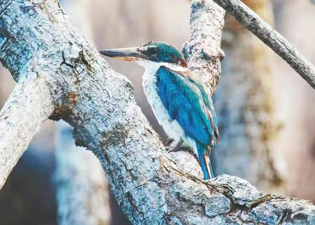 任荣霞介绍,白领翡翠和北港岛红树林内常见的白胸翡翠同目同科,但不同属,前者属于林翡翠属,后者属于翡翠属。从外观来看,两者个头相差不大,最大的区别是羽毛颜色。前者羽毛只有两种颜色,颈部、胸部、腹部羽毛均为白色;头顶、两翼、背及尾呈亮丽蓝绿色。后者羽毛颜色相对杂乱些,仅胸部为纯白色,头部、后颈等处分布着棕栗色羽毛。