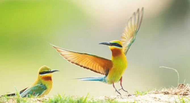 佛法僧目鸟类大都羽色艳丽、举止优雅,多明星鸟种。在海南知名度最高的当数蜂虎,它是佛法僧目蜂虎科鸟类的统称。近年来,海南各地大力推进退塘还林还湿,增加了蜂虎的生活空间,这种喜欢栖息在近海地带的鸟大量繁殖,成为一道美丽的风景线。在观鸟爱好者中有“鸟界四大美人”之说,它们分别是翠鸟科的翠鸟、蜂虎科的黄喉蜂虎、佛法僧科的蓝胸佛法僧、戴胜科的戴胜,它们中的大部分为佛法僧目鸟类。