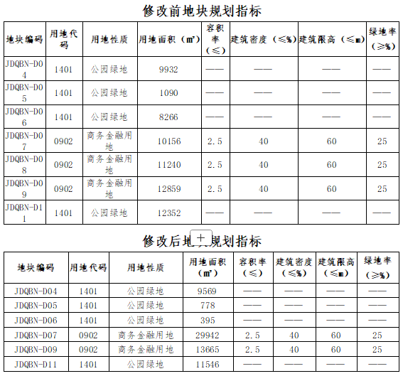 将JDQBN-D04、JDQBN-D05及JDQBN-D011部分用地用地性质由公园绿地(1401)修改为商务金融用地(0902)。