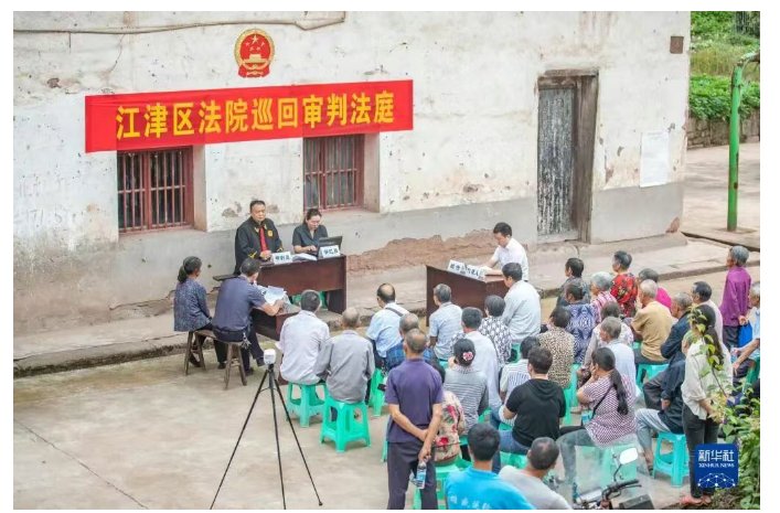 在重庆市江津区蔡家镇文昌村塘口村民小组,基层法官们在巡回法庭审理案件(2021年9月17日摄)。新华社记者 黄伟 摄