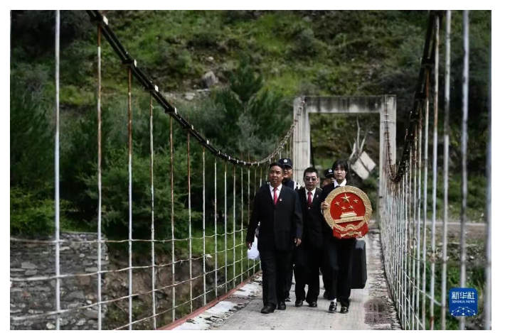 青海省果洛藏族自治州班玛县人民法院巡回法庭成员前往班玛县灯塔乡班前村提供法律服务(2021年8月7日摄)。新华社记者 张龙 摄