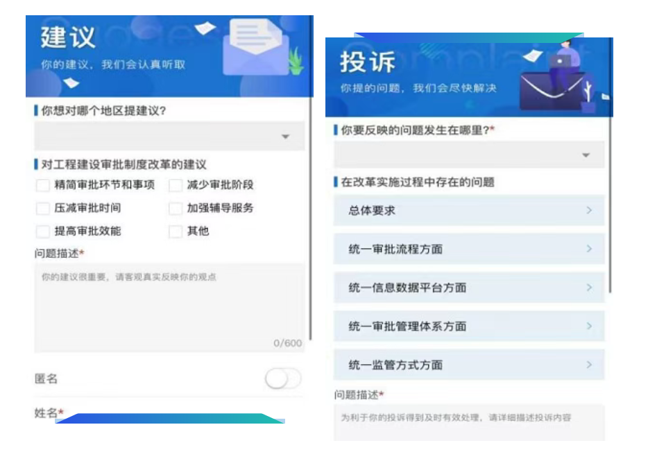 进入专栏点击建议即可针对性地对所属地区(可匿名)提出改革建议;点击投诉即可(可匿名)对存在问题进行详细描述。