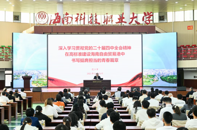 范少军围绕学习贯彻习近平总书记在党的二十届四中全会上的重要讲话精神和全会《建议》,从深刻领会“十四五”时期我国发展取得的重大成就,“十五五”时期所处的历史方位、面临的形势,“十五五”时期经济社会发展的指导方针、主要目标、战略任务和重大举措等方面,对全会精神作了全面宣讲和深入阐释,并结合海南自由贸易港建设和海口经济社会发展实际,重点围绕建设现代化产业体系、加快高水平科技自立自强、扩大高水平对外开放、扎实推进全体人民共同富裕等领域,与师生代表深入交流。他指出,要把学习贯彻全会精神与贯彻落实习近平总书记关于海南工作的系列重要讲话和指示批示精神,特别是习近平总书记在听取海南自由贸易港建设工作汇报时的重要讲话精神紧密结合起来,一体推进教育科技人才发展,为高标准建设海南自由贸易港提供有力人才支撑。