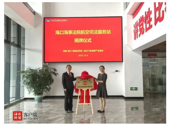 12月4日,海口海事法院航空司法服务站在位于海口江东新区临空经济区的海南自贸港一站式飞机维修产业基地揭牌成立。将海事审判司法服务延伸至航空维修产业一线,为基地入驻企业提供“零距离”的立案咨询、多元解决纠纷、巡回审判、法治宣传等司法服务,以一站式多元解纷护航“一站式”飞机维修。