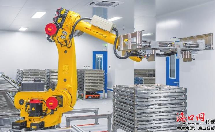 在海口药谷工业园的海南皇隆制药股份有限公司内,机械手臂将已装筐的药剂转移至托盘。记者 康登淋 摄