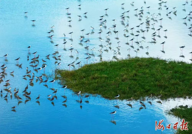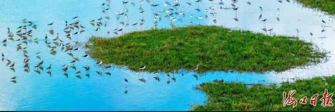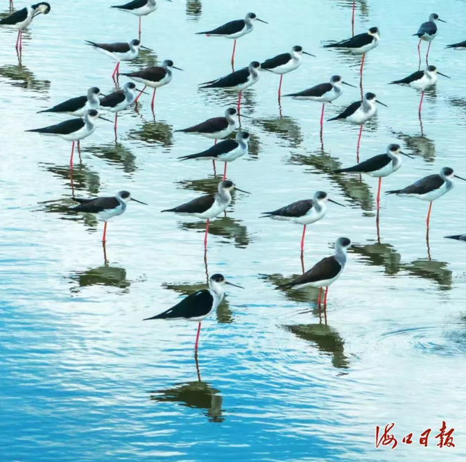 近日,在位于海口江东新区的东寨港国家级自然保护区下塘水鸟湿地保护小区,一群群黑白相间的水鸟迈着细长的腿在湿地中行走,不时晃动脑袋,将弯曲的长嘴探入水中觅食。据悉,当天共监测到50多只反嘴鹬,系历年最多。