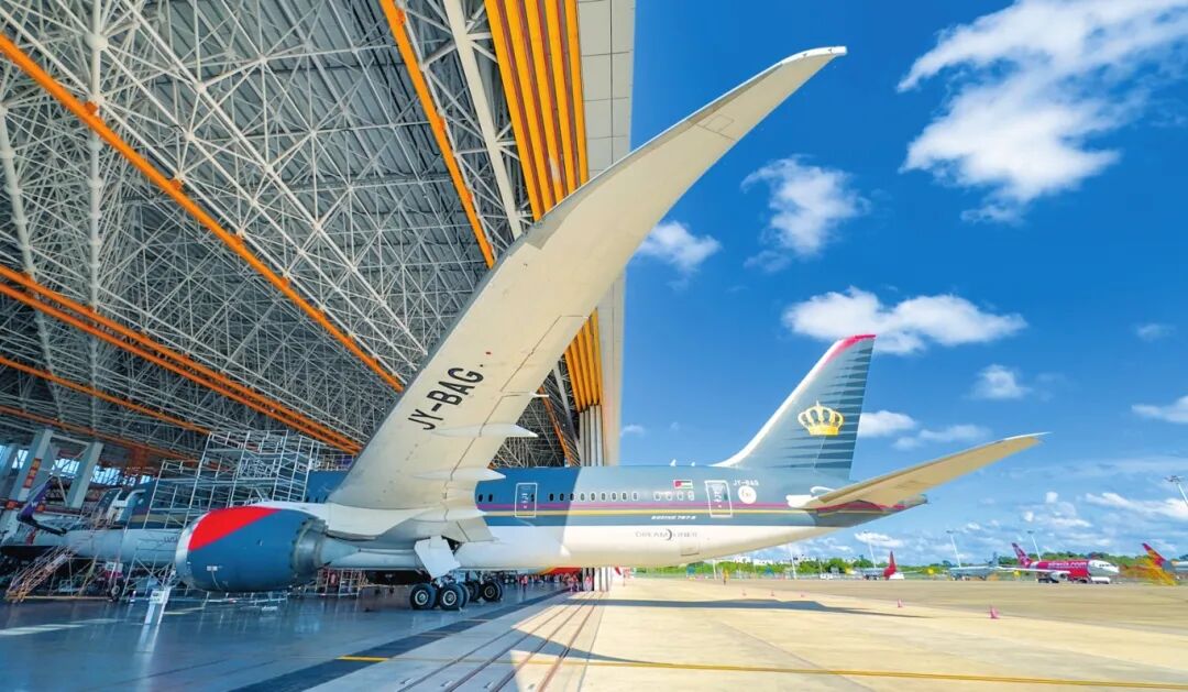 9月12日,一架来自约旦皇家航空的波音787型飞机,在海南自贸港一站式飞机维修产业基地接受海航技术旗下大新华飞维、海航斯提斯提供的专项改装和整机喷漆服务。 海口日报记者 苏弼坤 通讯员 张健 摄