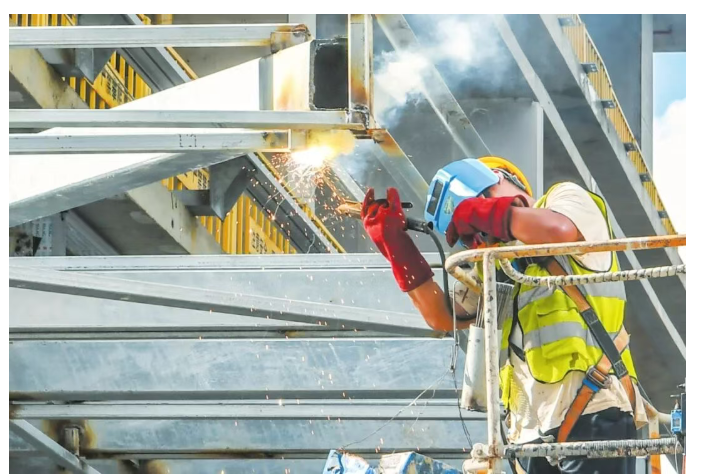 9月17日,在山东国际业务集聚区项目现场,施工人员正在焊接外墙龙骨。海口日报记者 孙士杰 摄