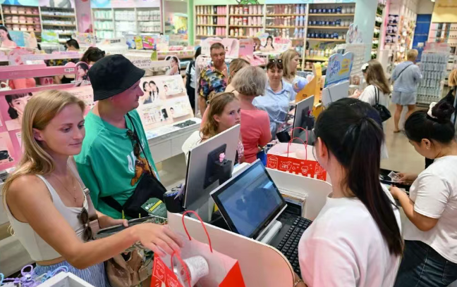 外国游客在三亚一家商店购物。 新华社记者 郭程 摄