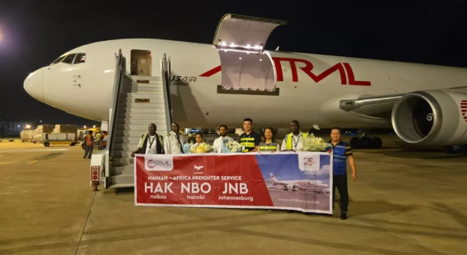 10月2日,一架装载48吨货物的B767-300全货机从海口美兰国际机场顺利起飞,经停东非肯尼亚内罗毕后,接着飞往南非约翰内斯堡,标志着海南自贸港首条直达非洲的国际货运航线“海口-内罗毕-约翰内斯堡”正式开通,进一步深化中非经贸合作。