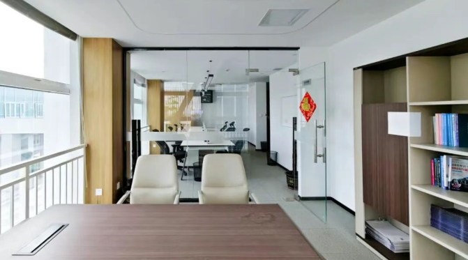 走入其中,第一感受是“小而精,全而暖”。从10㎡的办公微空间到30㎡的独立办公室灵活可选,不管是2人初创工作室还是5人小团队,都能找到适配区域。落地窗外就是园区的纷繁绿意与高楼景致,与之为邻的则是江东新区483家重点企业,其中包括48家世界500强企业。