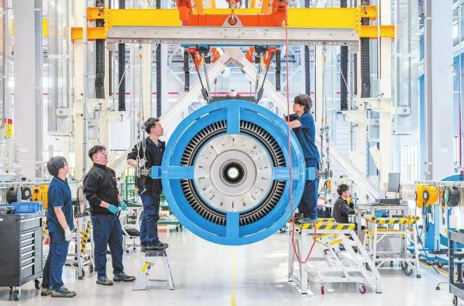 在海口美兰空港吉耐斯航空发动机维修工程有限公司车间内,工作人员正在对航空发动机进行检修。海口市融媒体中心记者 苏弼坤 实习生 陈新锐 摄