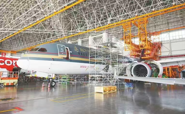 听我在约旦的小伙伴说,以前他们在一个地方做完定检,想要做新的涂装,还要山长水远飞去另一座城市,又费时又费钱。如今在海南自贸港,我的定检、改装、起落架更换、喷漆都能一站式搞定。