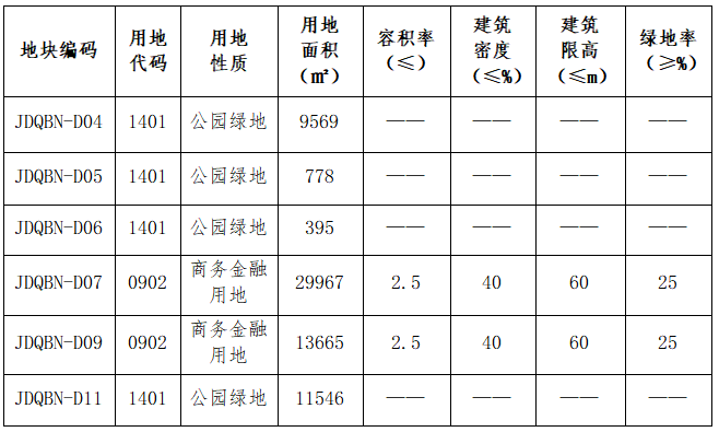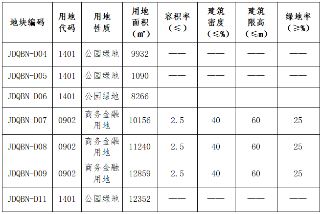 调整整合后的商务金融用地指标拟按原指标不变,即容积率不大于2.5。具体调整内容见下表:
