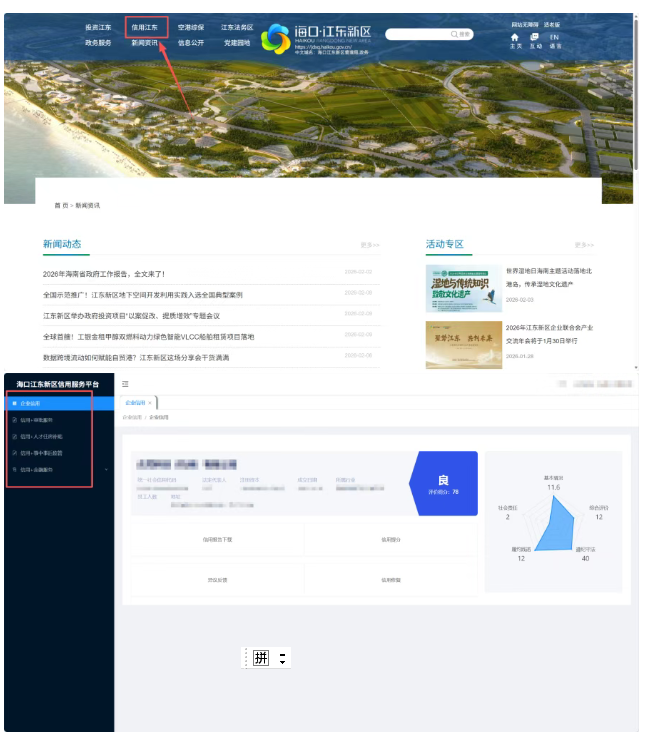 ① 登录系统:打开浏览器,搜索“海口江东新区管理局”,或直接输入网址(https://jdxq.haikou.gov.cn),点击页面上方“信用江东”板块,进入信用查询页面;
