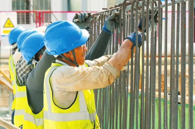 循声步入工地,眼前是一片忙碌的施工景象。基坑深处,建设者们头戴安全帽、身着工作服,分散在各个作业面上。忙碌的身影不断穿梭,绑扎、焊接、测量……每一个动作都专注而娴熟,汗水滴入钢筋水泥间,一点点浇筑出椰城未来的坚实轮廓。