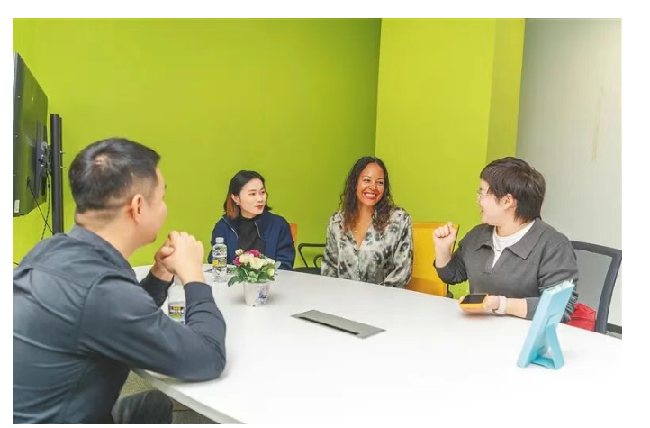 在海口复兴城互联网信息产业园,来自比利时的卡罗(右二)在和园区企业交流。海南日报全媒体记者 袁琛 摄