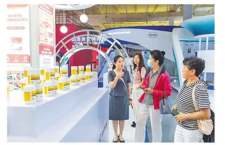 在博鳌乐城“永不落幕”国际创新药械展,销售专员在为游客介绍特许保健食品。海南日报全媒体记者 袁琛 摄