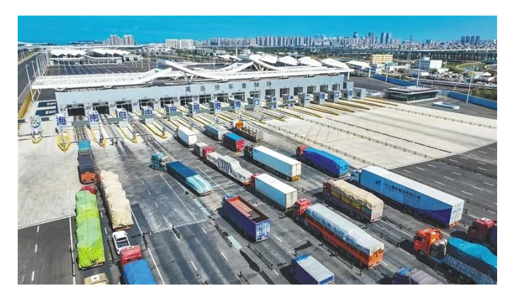 出岛货车有序经过海口新海港和南港“二线口岸”(货运)集中查验场。海南日报全媒体记者 张茂 摄