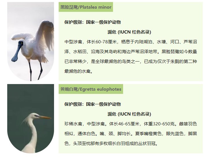 全球濒危的国家一级保护动物黑脸琵鹭,近年连续在此稳定越冬,最多记录达6只,此外还有黄嘴白鹭、卷羽鹈鹕等十余种珍稀鸟类在此现身。