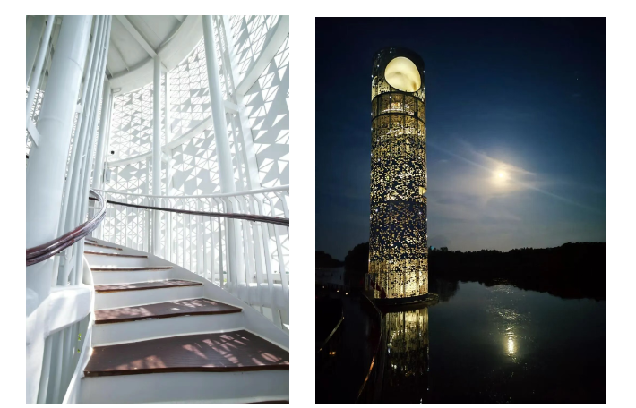 月之塔采用镂空式防台风设计,不仅能抵御强风侵袭,更减少了建筑反光面,避免光污染干扰候鸟的飞行与栖息。
