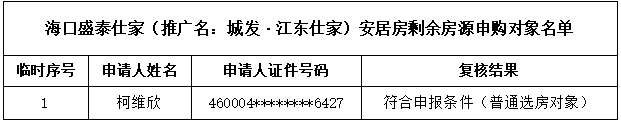 海口盛泰仕家(推广名:城发·江东仕家) 安居房项目剩余房源申购对象名单的公告