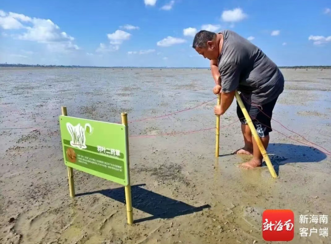 再开展滩涂“种草”。2025年6月,海草移植扩繁试验正式启动。科研团队筛选出适合北港岛生长的卵叶喜盐草、单脉二药草作为主要品种,针对连续海草区、斑块化海草区、裸露滩涂区三类底质,精准布设12个试验点,采用“草块移植法”开展作业。天还未亮,志愿者与村民便踏上滩涂,赶在退潮时段抢抓工期,采苗时要严格把控尺寸与深度,带足底泥却不损伤根系,当天采集的海草苗必须当天种下,大家深一脚浅一脚踩在泥泞里,小心翼翼将144块海草苗逐一栽种,再围上护栏、竖起科普牌,历经近10天的辛苦劳作,海草苗终于在滩涂上安了家。