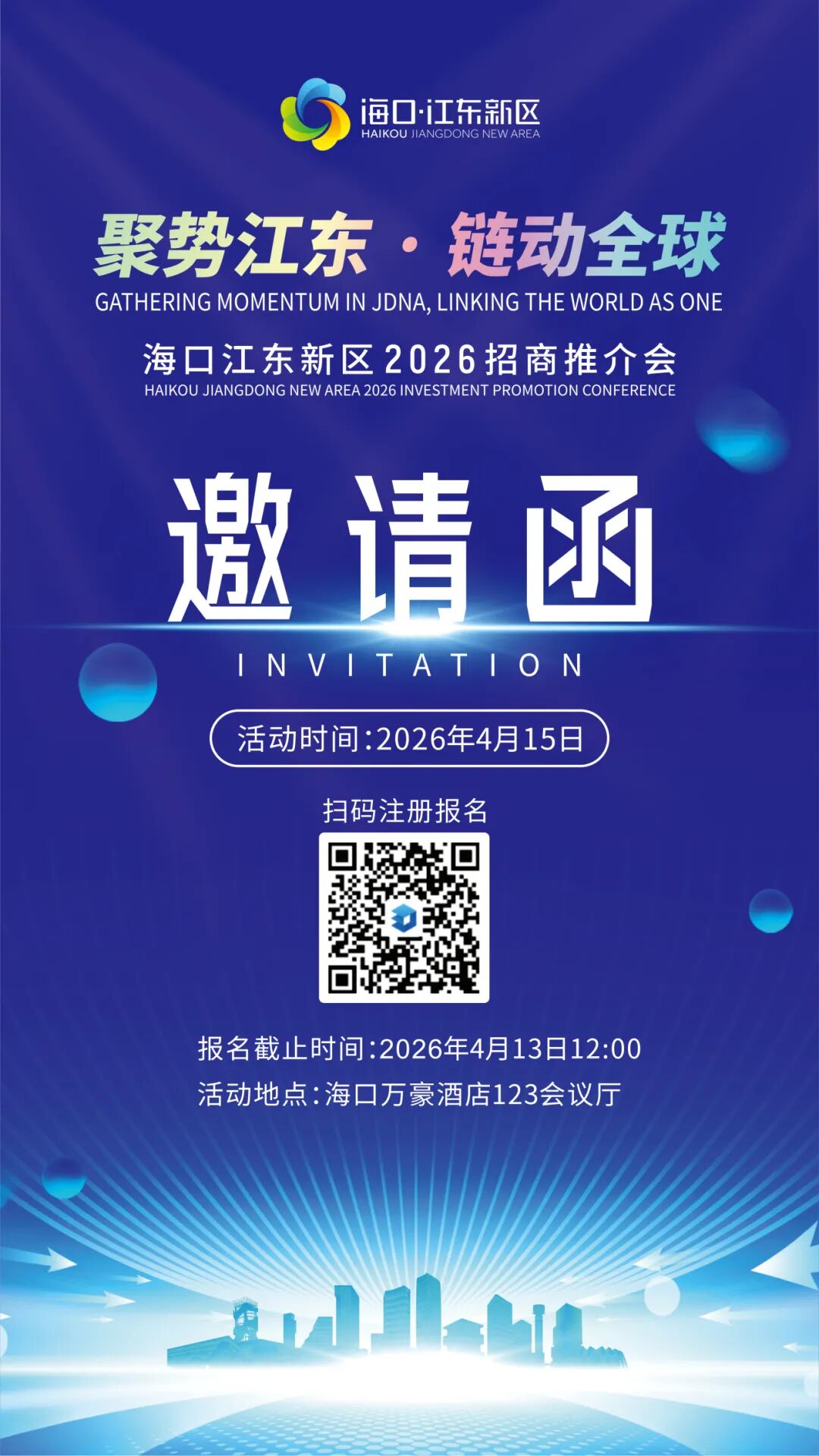 为深入贯彻海南自贸港建设部署,借力消博会全球平台,“聚势江东・链动全球” 海口江东新区2026招商推介会将于2026年4月15日举办,诚挚邀请全国优质企业、金融机构、专家学者与产业精英齐聚椰城,全方位感受江东新区发展势能、政策优势与投资热土魅力,共商合作、共拓商机、共赢未来。